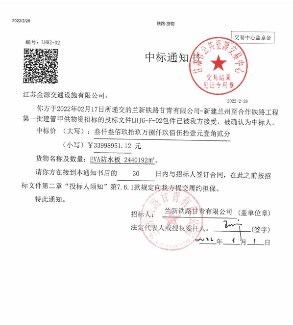 新建兰州至合作铁路工程甲供物资中标通知书
